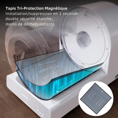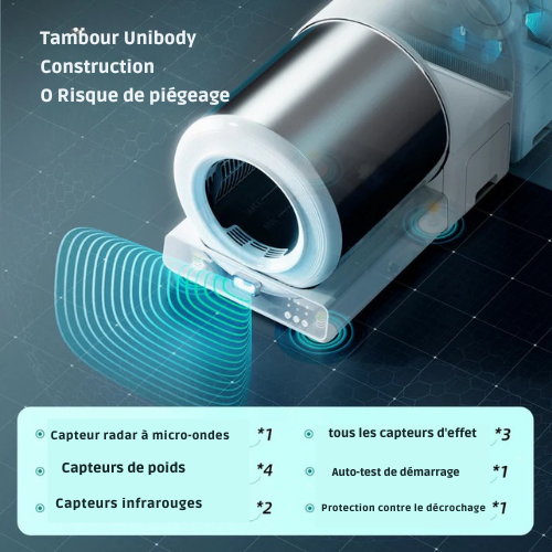 Inoxora™ intègre 12 protections de sécurité : radar micro-ondes, capteurs infrarouges, détection à effet Hall, protection contre le blocage du moteur, capteurs de poids et test automatique au démarrage. Le nettoyage s’arrête instantanément si votre chat s’approche ou entre, assurant une sécurité totale.