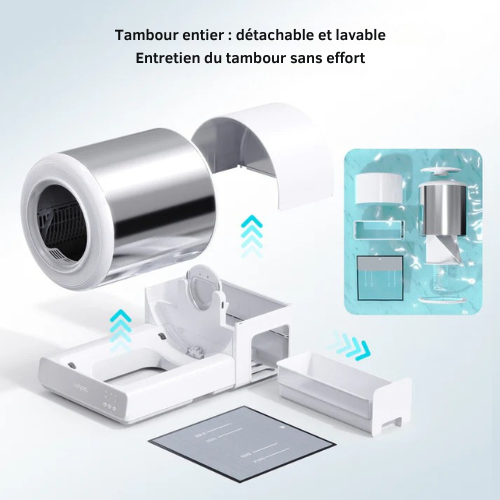 Tirez le tiroir, fermez le sac, retirez-le — le nettoyage prend seulement quelques secondes. Une solution hygiénique qui limite le contact et garde vos mains propres.