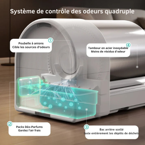 Le compartiment arrière scellé de 6L permet jusqu’à 14 jours d’utilisation sans intervention. La répartition intelligente des déchets évite les amas au centre, maximisant la capacité et réduisant l’entretien pour les propriétaires occupés.
