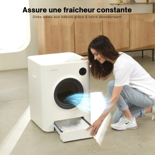 Le système de désodorisation intégré neutralise les mauvaises odeurs lors de chaque cycle. Le tiroir à déchets hermétique emprisonne les odeurs tandis que les sacs à déchets intelligents fournis facilitent l’élimination de manière propre et hygiénique. Les surfaces intérieures antiadhésives permettent un entretien simple et rapide.