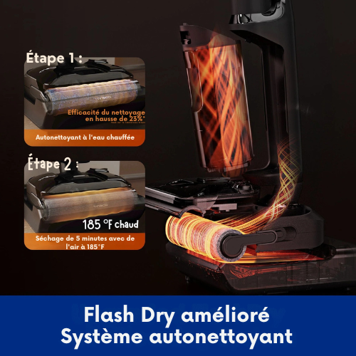 Nettoyer l’aspirateur n’a jamais été aussi simple. Le système d’auto-nettoyage FlashDry utilise de l’eau chaude pour dissoudre les saletés tenaces du tuyau jusqu’à la brosse, puis diffuse de l’air chaud à 85°C afin de sécher chaque composant interne. Ce processus automatique et sans contact élimine le besoin de nettoyage manuel ou d’un port de soufflage séparé — vous garantissant une expérience hygiénique et sans effort à chaque utilisation.