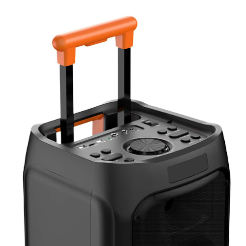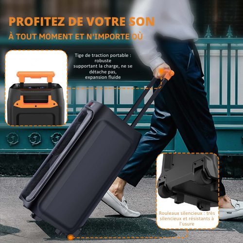 Conçue pour être mobile, la SonicFrame™ est dotée de roulettes silencieuses et d’une poignée télescopique permettant un transport simple et rapide. Sa batterie rechargeable de 4400 mAh assure jusqu’à 8 à 10 heures d’utilisation — idéale pour les soirées karaoké, les événements et les fêtes en extérieur.