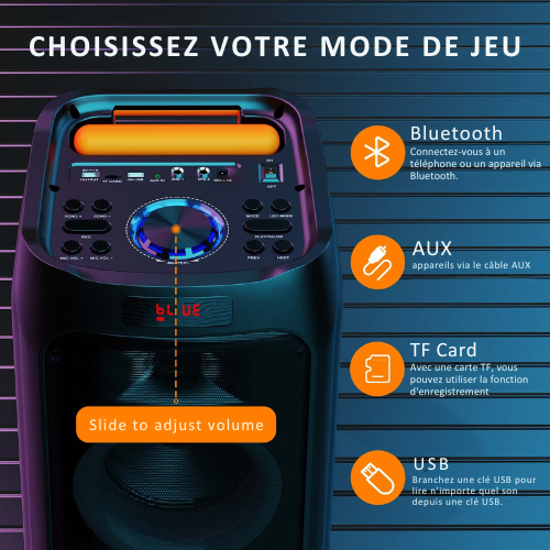 • Modes de Lecture : Bluetooth, AUX, USB, TF, FM