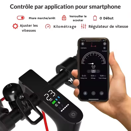 Velixa™ est équipée d’un plateau large antidérapant offrant un excellent confort de conduite. Son écran LCD intelligent affiche en temps réel la vitesse, le niveau de batterie, la distance parcourue, le mode de conduite et l’état de l’éclairage pour un contrôle total, même de nuit.